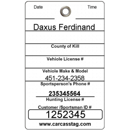 These Tags are intended for the land owner to give to the people leasing there land for hunting purposes. These tags have a duel purpose, land and land owner information on the front and a field tag with the hunters information on the back. This tag will help fish and game know weather you have the right to fish or hunt on said land.