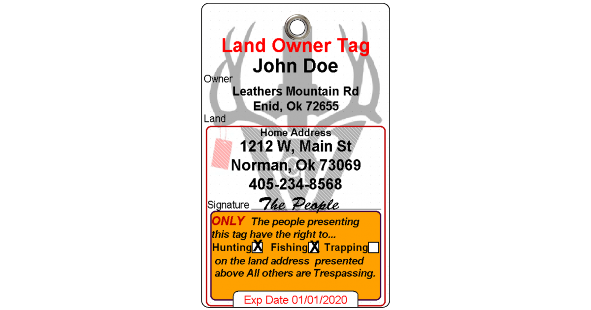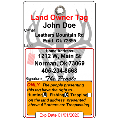 Land Owner Tag. These Tags are intended for the land owner to give to the people leasing there land for hunting purposes. These tags have a duel purpose, land and land owner information on the front and a field tag with the hunters information on the back. This tag will help fish and game know weather you have the right to fish or hunt on said land.