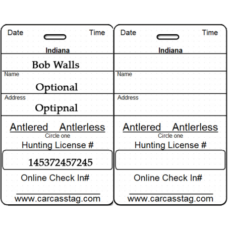 Carcass Tags are transportation / field tags used for tagging your kill. Most states require you to put one of these types of tags on your animal before moving it from the field. Our tags are the the same size and thickness as a credit card and are laminated on both sides.